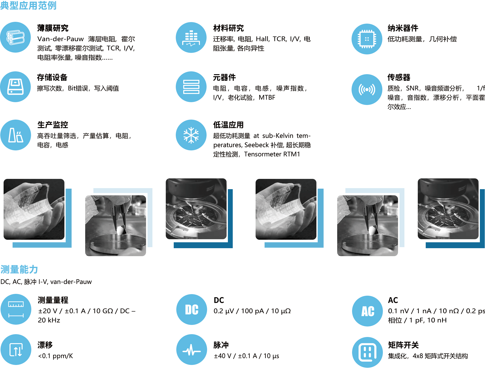 DC, AC, pulsed I-V, van-der-Pauw, 零漂移霍尔测量, |